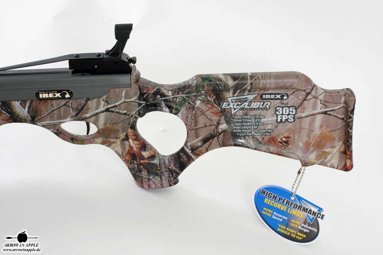 Die Ibex besitzt die gleichen technischen Leistungsdaten der Phoenix. Der Unterschied besteht im komfortableren Daumenlochschaft und dem dadurch gering höheren Gesamtgewicht bzw. der etwas anderen Farbgebung. Achtung: Aus Sicherheitsgründen bieten wir nur original Excalibur Zubehör wie, Stringer, t- handle Spannhilfe, Sehnen, Köcher, Zielfernrohrschiene usw. an. Man erkennt es an der Kennzeichnung des Produktes bzw. der Verpackung. Im Datenblatt der Phoenix finden Sie die techn. Daten |