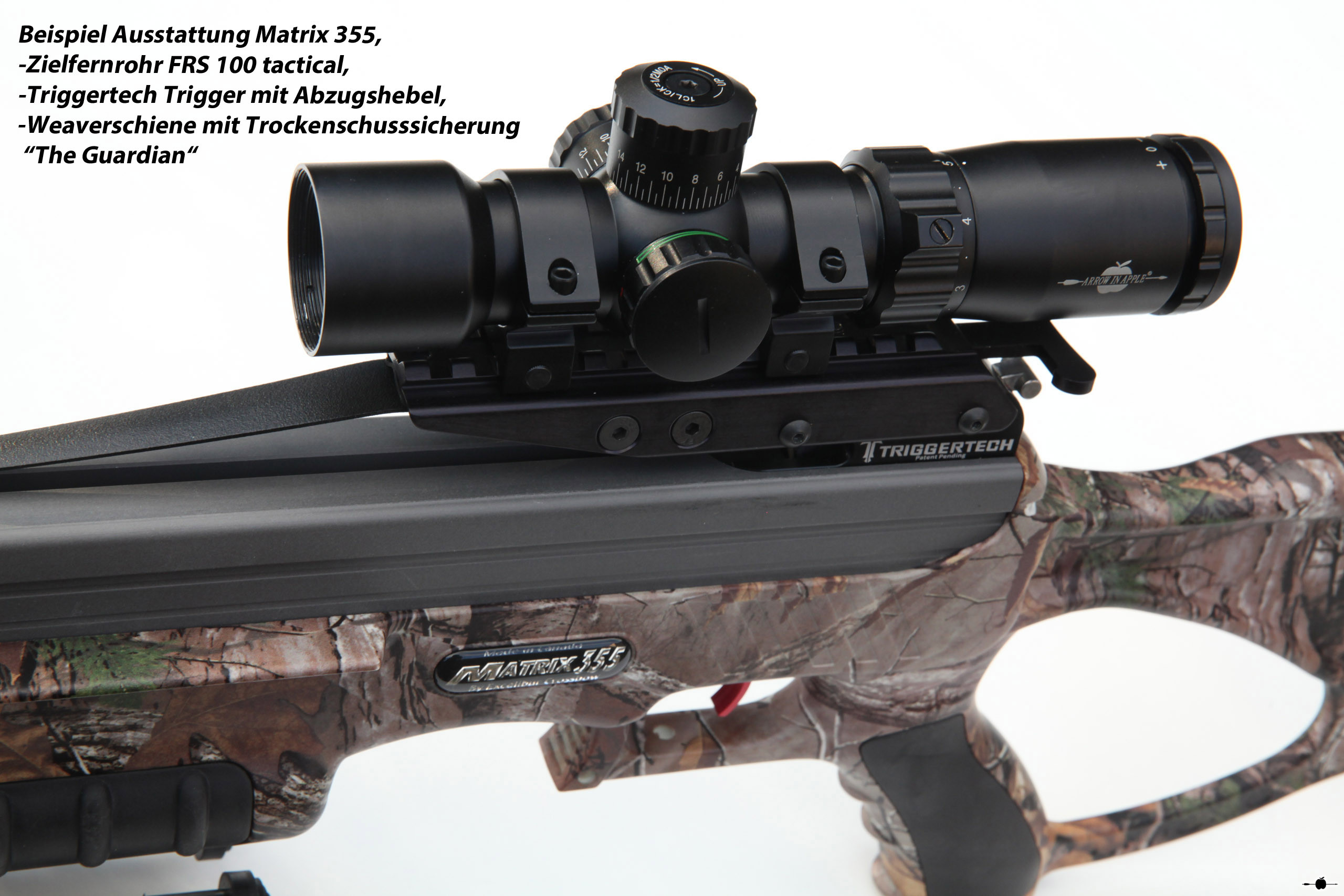 Die Matrix 355 ist neben der 350 LE wohl das vernünftigste und ausgewogenste Modell der Matrix Reihe. Zumal wird sie eher unterschätzt. Hinzu kommt, dass sie mit allem "aufrüstbaren" Zubehör was geht, schon in die Matrix 380 Preis Kategorie aufsteigt. Neben dem Defizit der fehlenden seienmäßigen Ausrüstung, wie Trockenschusssicherung, Schaftbacke, R.E.D.S. Dämpfung und ZF usw. hat sie trotzdem hat sie einen ganz klaren Vorteil, die Matrix 355 arbeitet nicht am Limit wie die 380 und ist trotzdem so schnell wie die Vorgänger Equinox oder Exomax, nur halt wesentlich kompakter. Das Zubehör kann man sich auch nach und nach dazu kaufen. Auch wie abgebildet mit Triggertech und Komplettausrüstung erhältlich. Bitte anfragen!! Zusätzliche Dämpfungssysteme wie die Air Brakes und die Brake Pads machen die Matrix noch leiser und ruhiger. Wir empfehlen wie für alle Excalibur Armbrüste immer einen Stringer. Nicht enthalten, optionales Zubehör: R.E.D.S., Wangenauflage, Trockenschusssicherung u.v.a. |