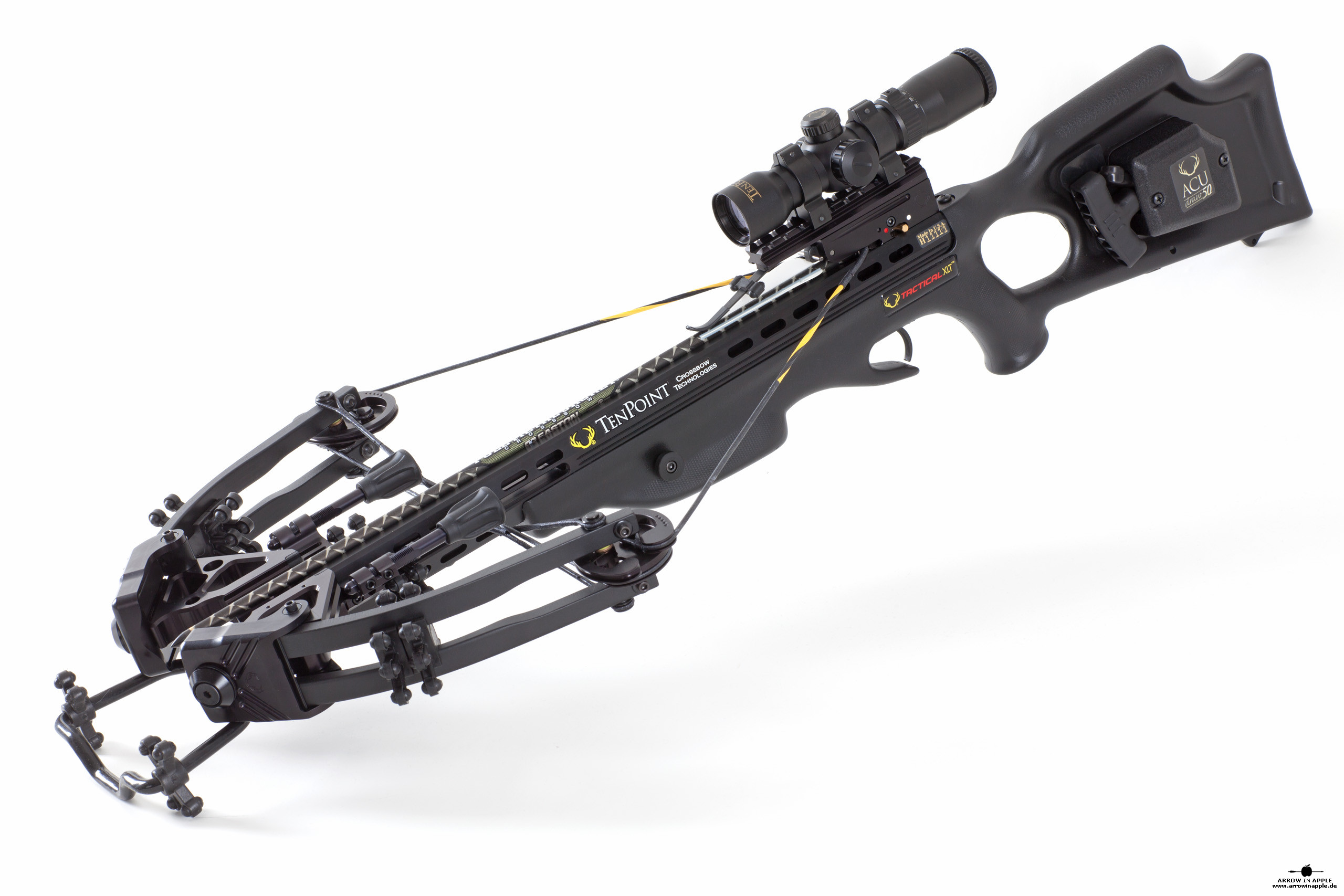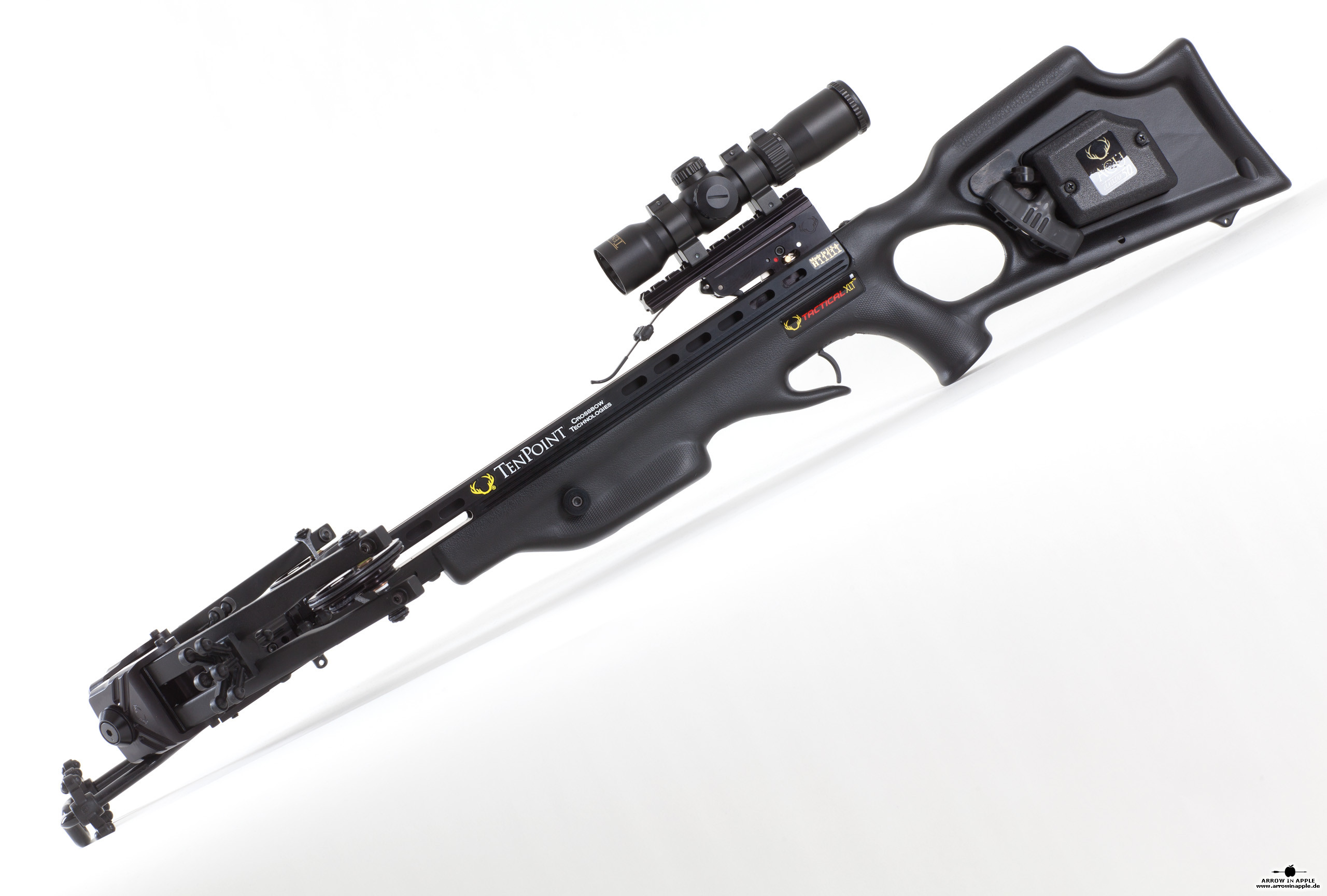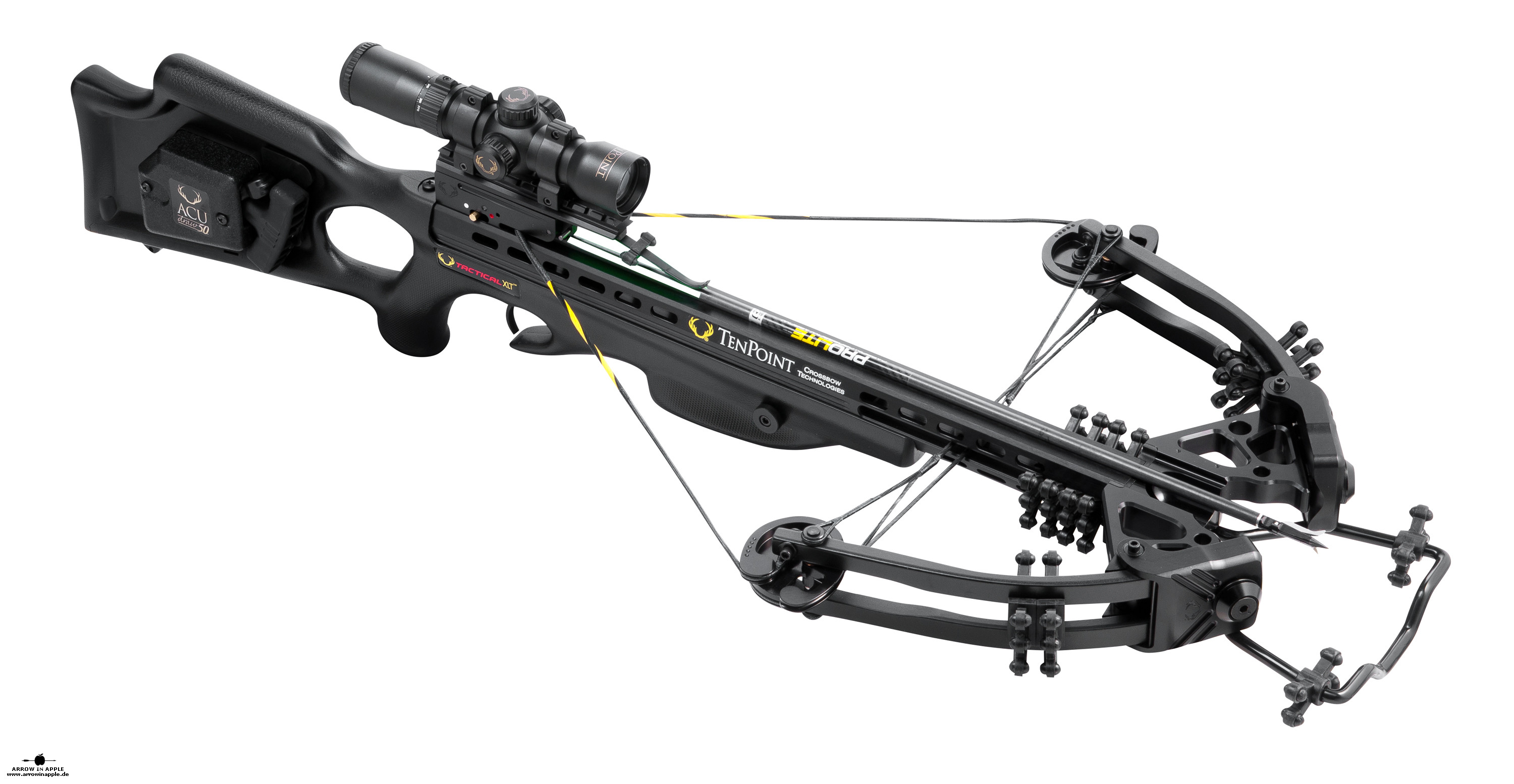Die TenPoint Tactical XLT reiht sich, wie es das XLT Kürzel verrät, in die Kompaktklasse der Armbrüste ein. Dabei kommt sie nicht wie gewohnt in Camo sondern komplett in schwarz. Die Unterschiede zur Carbon Elite XLT liegen nicht nur in Aluminium-Pfeilführungsschiene, Farbe und Gewicht, auch das Sehnendämpfungssystem SDS ist neu. Dieses arbeitet mit dem optional erhältlichen Bow Jax Dämpfungssystem besonders leise und reduziert Bogenschwingungen. Die übrigen technischen Daten sind identisch. Die Tactical XLT ist nicht nur ein "kompaktes" Schmuckstück, das Trefferbild der ist bei dieser Armbrust wie bei den anderen TenPoint Modellen auch perfekt genau. Natürlich mit dem bereits von uns vorjustierten und eingestellten rot/ grün beleuchteten 3-9 x 42 AIA FRS 101 Zielfernrohr. |