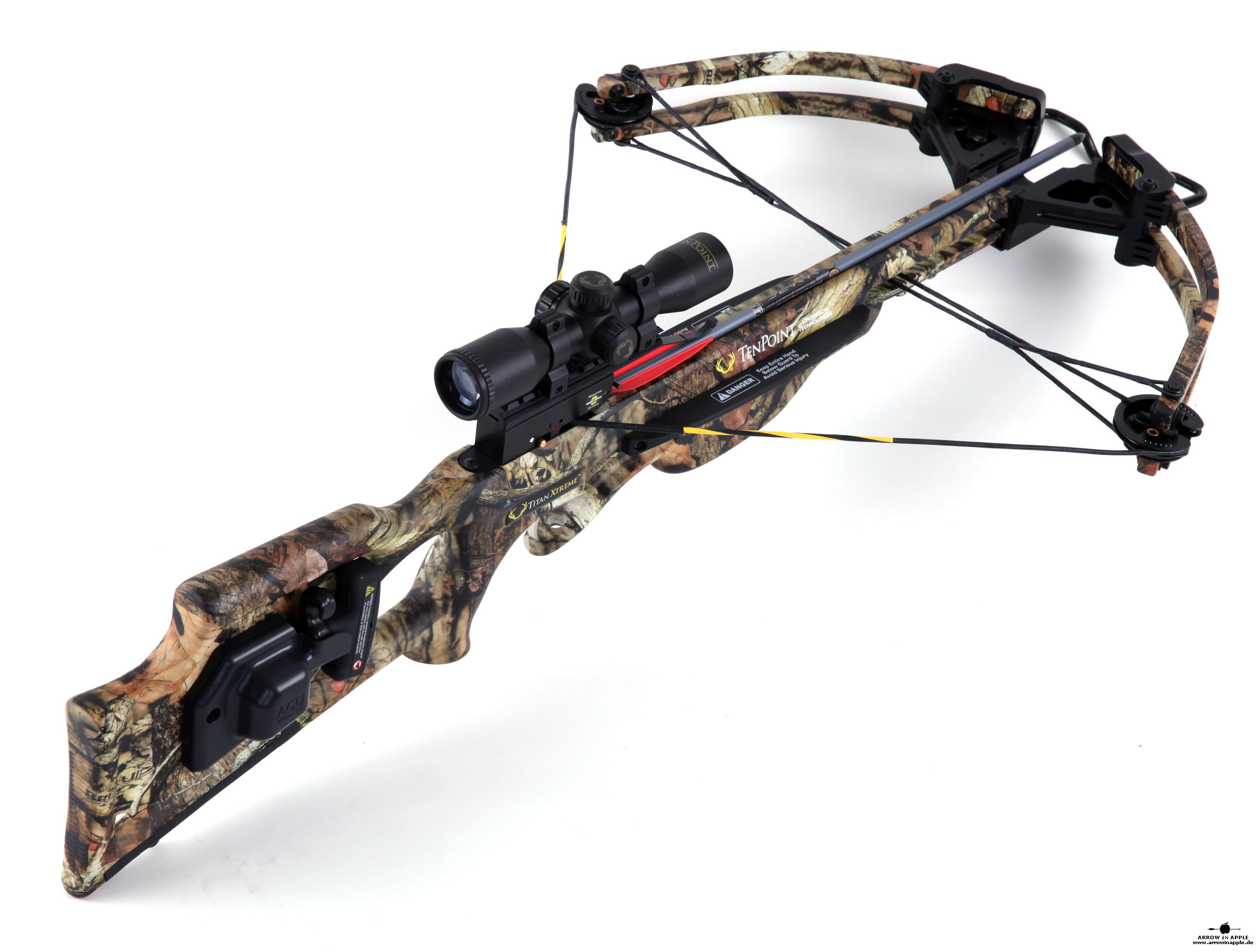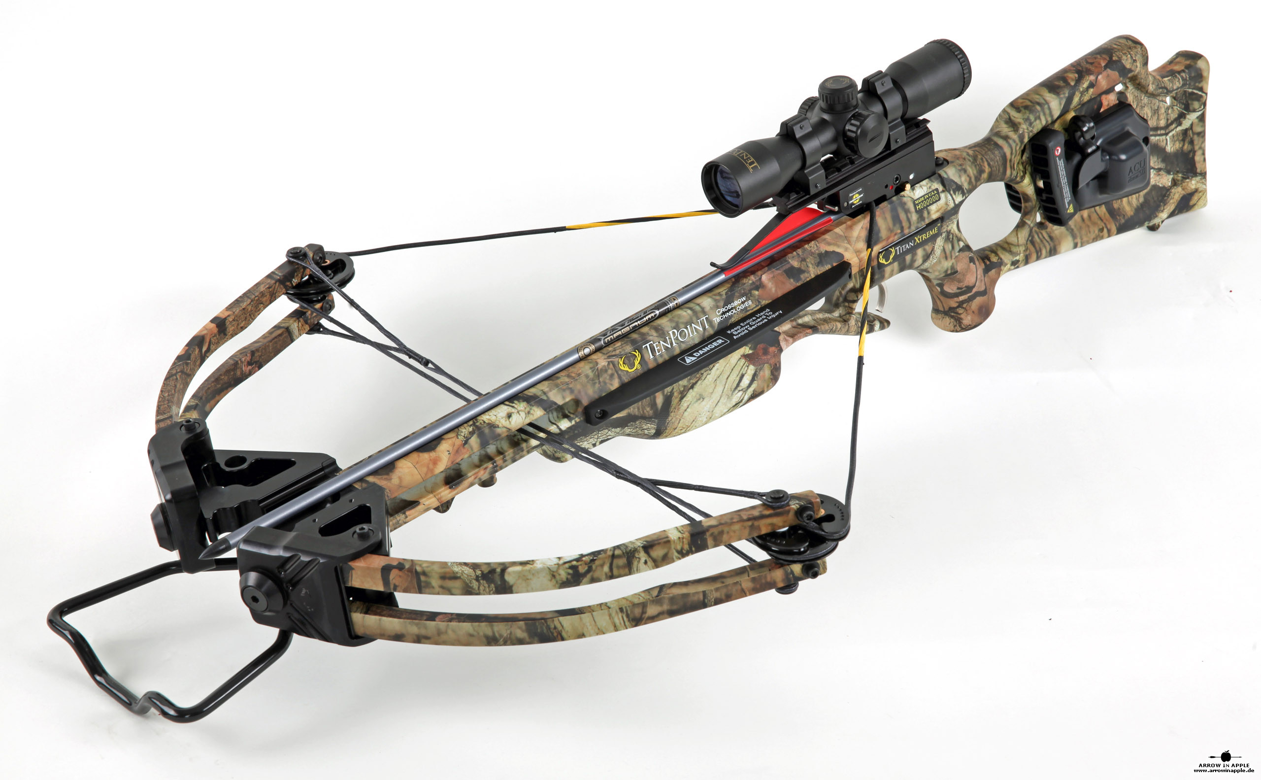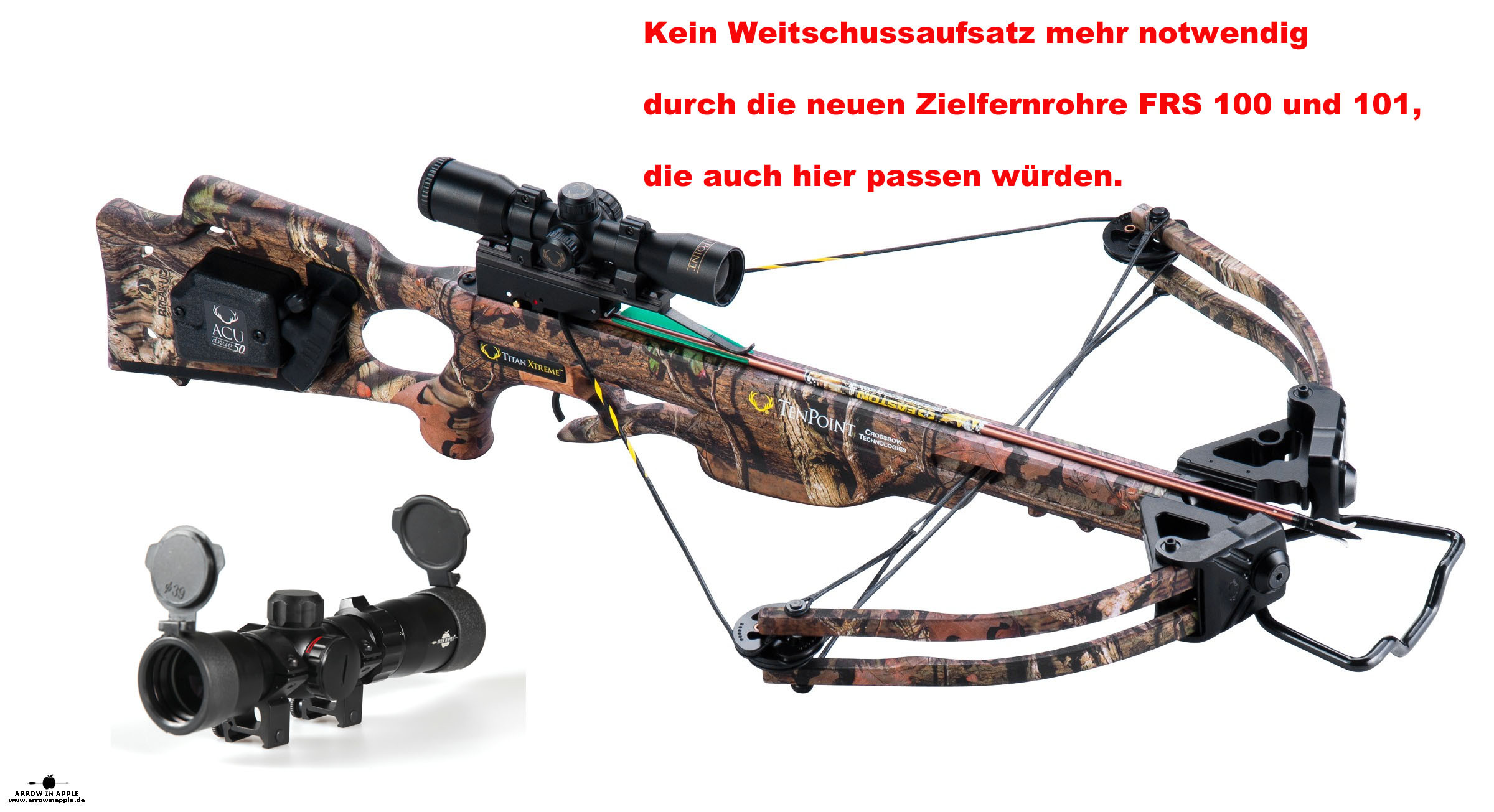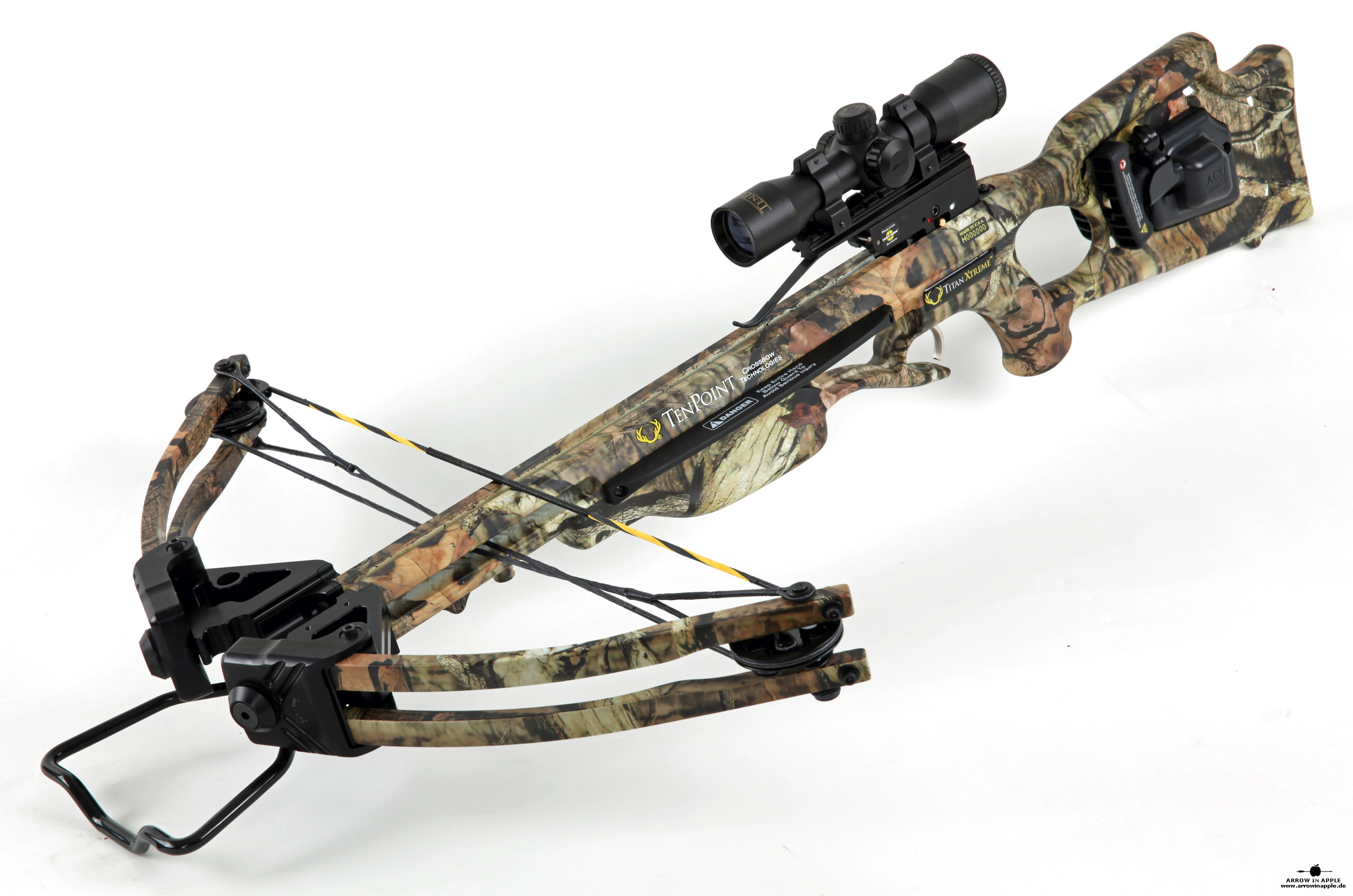 Die TenPoint Titan Extreme wird nicht mehr produziert, Der Nachfolger ist die Titan SS. Sie ist ist mit die beliebteste Armbrust in den USA. Präzise, im Verhältnis zu normalen Armbrüsten kompakt, robust, mit einem bereits eingeschossenen, rot grün beleuchtbaren Pro View 2 Zielfernrohr versehen hat sie ein sehr gutes Preis/ Leistungsverhältnis. Die Spannhilfe (ACU DRAW 50) kann im Schaft eingebaut werden. Mit nur einer einzigen Schraube wird die Armbrust zusammengebaut, d.h. Bogen und Schaft (inkl. Schiene und ZF). Das Zielfernrohr deckt alle Entfernungen zwischen 0-60m exakt ab. Für größere Entfernungen bietet sich der Weitschussaufsatz von HHA Sports an oder ein AIA FRS Zielfernrohr. |