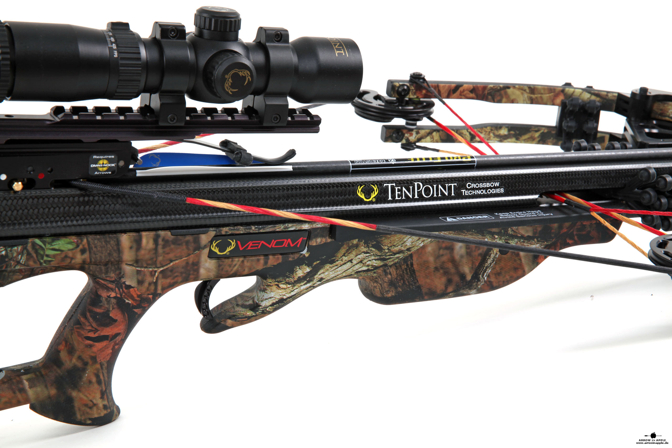 Die TenPoint Venom Kompakt - Armbrust ist in den beschriebenen Abmaßen das schnellste Teil, was die "TenPoint- Schmiede" 2014 herausgebracht hat und sie wiegt dazu noch unter 3kg. Sie besitzt die 2 wichtigen Sicherungen (automatische Abzugssicherung und die patentierte Trockenschusssicherung) und ist serienmäßig mit einem ACU Draw 50 oder wahlweise einem ACU Draw ( Kurbelspannhilfe - für einen Aufpreis ) ausgerüstet. Wir empfehlen zu dieser Armbrust wie zu allen TenPoint Modellen das SDS Sehnen Dämpfungssystem. Das Sehnen- und Kabelsystem ist vom Premiumhersteller Viper X. Außerdem kommt sie ebenfalls serienmäßig mit dem 1,5-5 x 32 Rangemaster Zielfernrohr, welches vom Hersteller bereits eingeschossen geliefert wird. Das Rangemaster deckt alle Entfernungen bis ca. 70m ab. Das von uns empfohlene AIA FRS 101 kann Entfernungen mit der Venom bis 170m bewältigen. Beide Zielfernrohre sind bestens für den 3D Sport oder auch die Jagd gerüstet und darüber hinaus mit dem 101 für das Targetschiessen auf kurze bis Megaentfernungen weit über 100m.